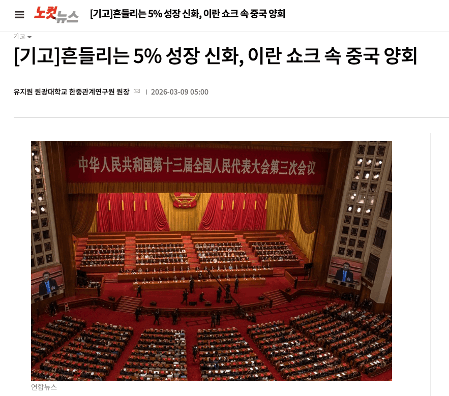 [2026.03.09] 원광대학교 한중관계연구원 유지원 원장 노컷뉴스에 2026 중국 양회 분석 칼럼 기고