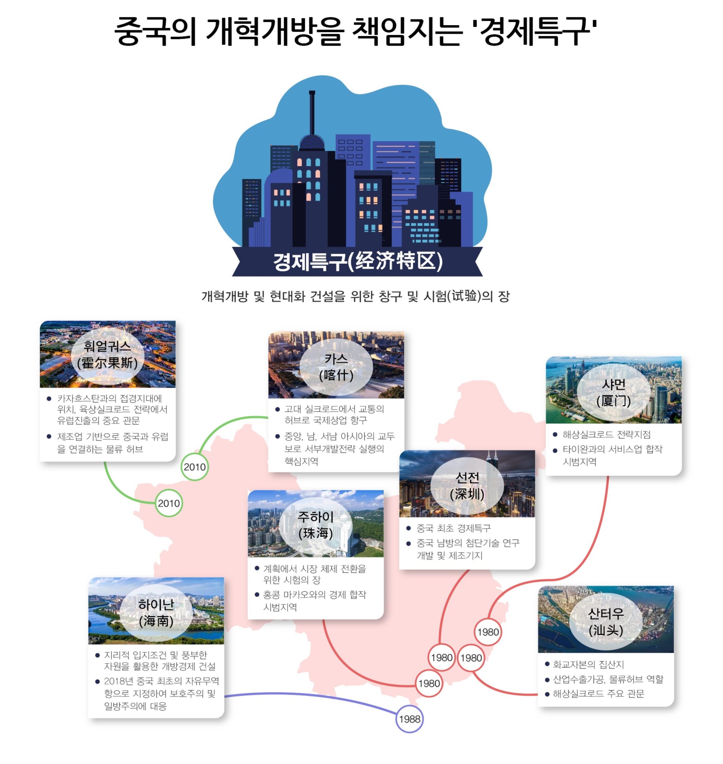 경제특구(经济特区)는 개혁·개방 및 현대화 건설을 위한 창구 및 시험(试验)의 장으로써 대외무역확대, 외자 및 기술 유치, 특정지역의 경제발전 제고의 목적이 있음. 선전, 주하이, 샤먼, 산터우가 1980년대 지정되어 중국의 개혁개방의 기수가 됨. 이어 하이난, 그리고 최근 일대일로 사업의 실효성을 제고하기 위하여 카스, 훠얼궈스가 경제특구로 지정되어 중국의 서부지역 개혁개방을 이끌고 있음.