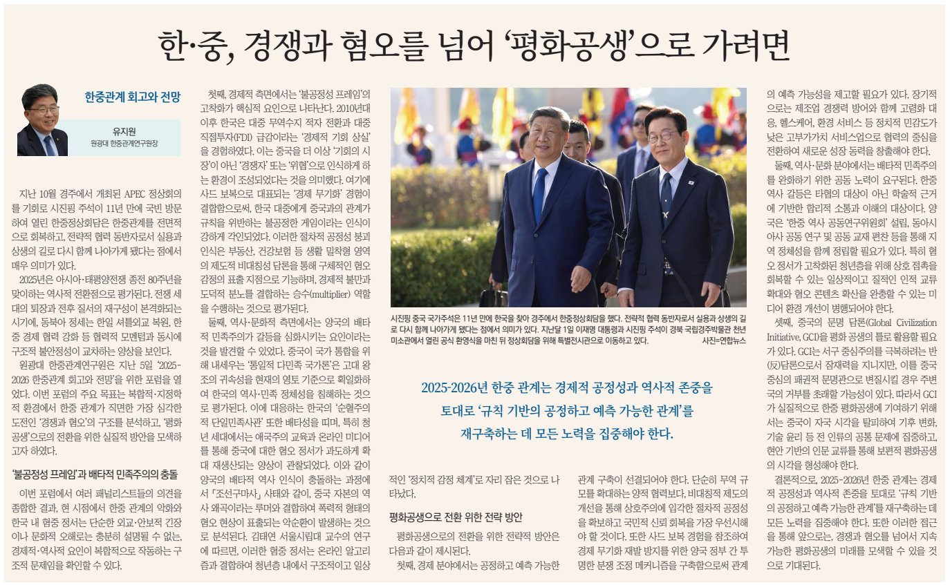 원광대학교 한중관계연구원 유지원 원장은 최근 교수신문에 「한·중, 경쟁과 혐오를 넘어 ‘평화공생’으로 가려면」을 주제로 기고문을 발표했다. 이번 글은 지난 12월 5일 개최된 ‘2025-2026 한중관계 회고와 전망’ 포럼의 논의를 바탕으로 작성되었으며, 한중 관계의 현안과 미래 전략을 종합적으로 정리했다.