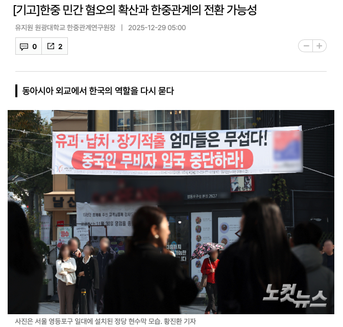 [2025.12.29] 한중관계연구원장, 노컷뉴스 칼럼 게재 – “혐오의 정치화 넘어 공존의 외교 모색해야”